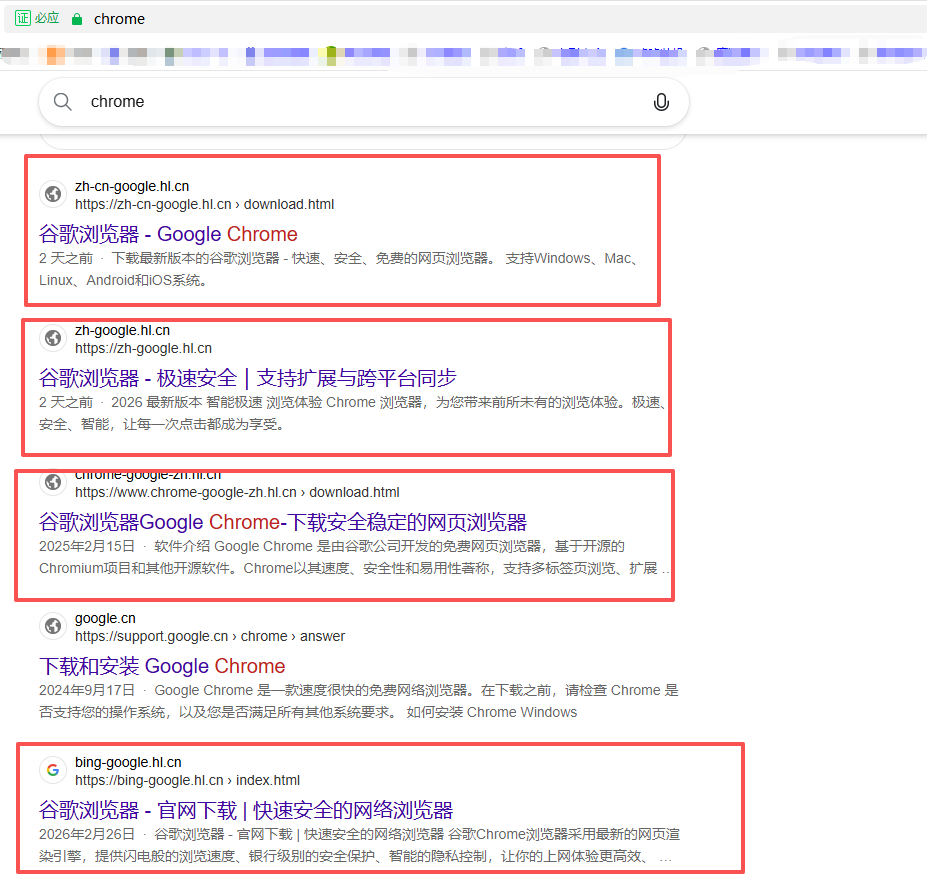 以必应(bing)搜索 “chrome”为例,搜索结果第一页几乎全部是仿冒链接,若电脑未安装杀毒软件,极易中招;即便安装了杀毒软件,也需提高警惕,切勿无视风险提醒进行操作